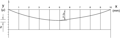 3) 連接一條以0位原點(diǎn)至P10的標(biāo)準(zhǔn)軸線,從中可知平行Y軸P5處導(dǎo)軌的最大偏差值(通過(guò)圖表可知偏差值為21.2μ)(見(jiàn)圖二)