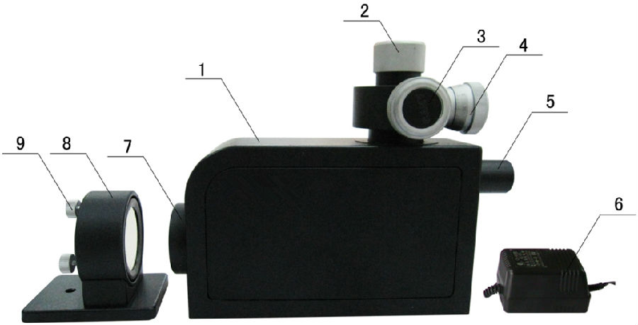 6、變壓器 7、望遠(yuǎn)物鏡 8、可調(diào)式反射鏡 9、調(diào)節(jié)螺釘