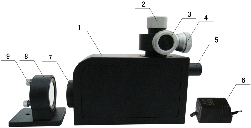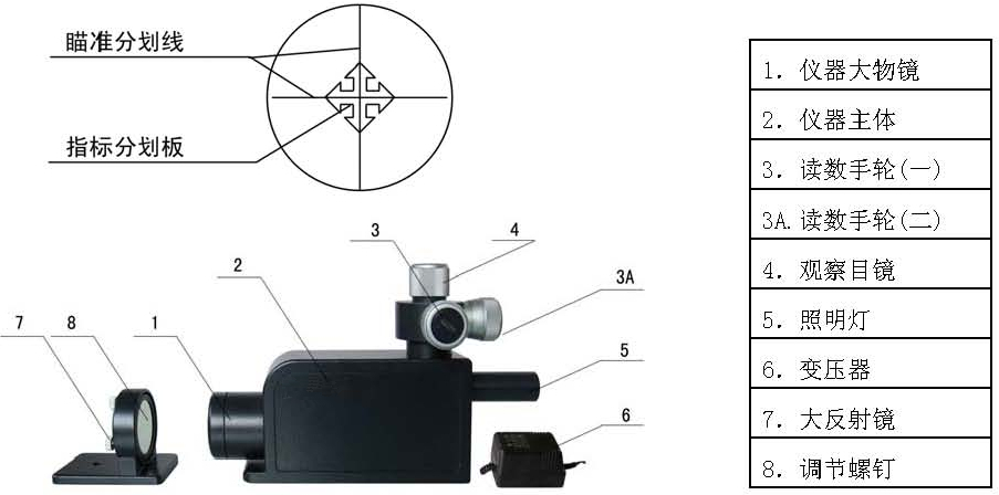 1、儀器底座調(diào)節(jié)螺釘 2、儀器主機 3、光源 4、測微器 5、觀察目鏡