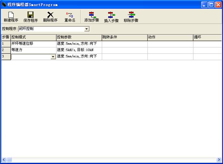 6、具有試驗過程控制模式智能設(shè)置專家系統(tǒng),提供給專業(yè)用戶自動程控編程器。用戶可以根據(jù)實際需要,按照規(guī)則靈活組合多種控制方式及控制速度,編制適合自己需要的控制程序。測控軟件會自動按照用戶設(shè)置自動控制試驗過程。