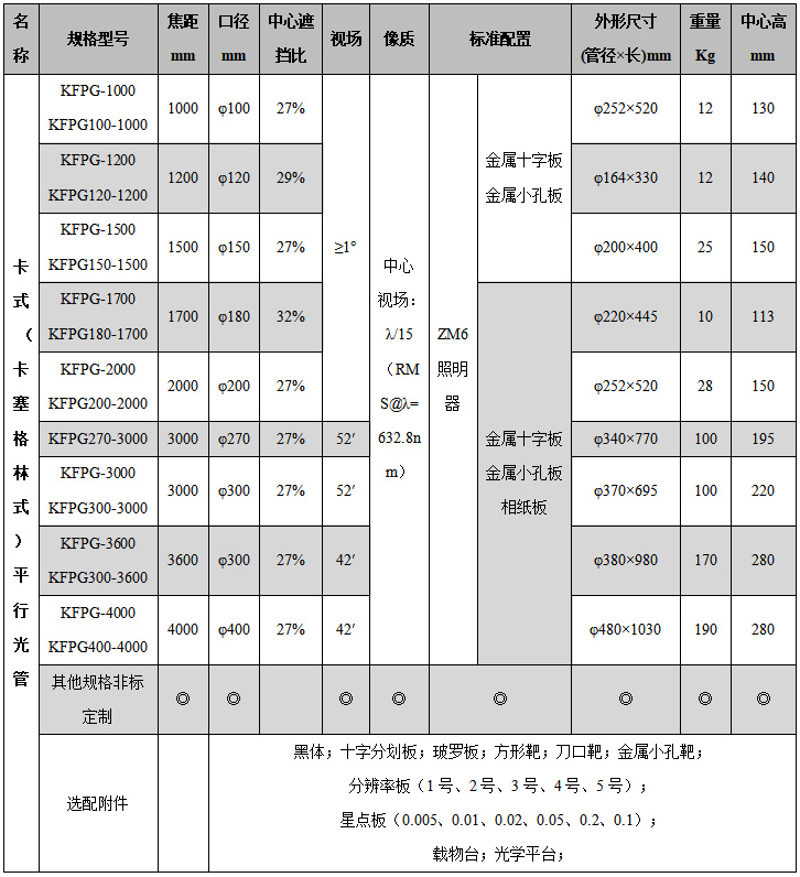 KFPG-1000 1000 100 27% 1° 中心λ/15(RMS@λ=632.8nm) KFPG-1500 1500 150 KFPG-2000 2000 200 KFPG-3000 3000 300 KFPG-4000 4000 400 標準配置 ZM6照明器;玻璃十字分劃板;金屬十字分劃板; 選配附件 黑體;靶板;載物臺;光學平臺;