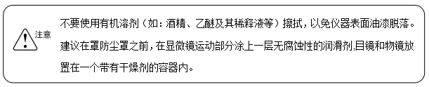 為防止發(fā)生短路或其它故障,請不要長時(shí)間在高溫,潮濕的環(huán)境下使用,適宜工作環(huán)境溫度5°C~35°C,相對濕度20%~80%(25°C時(shí))。如果有水灑在顯微鏡上時(shí),請立即關(guān)閉電源開關(guān),并拔掉電源線,然后用干布將水擦去。當(dāng)有異物進(jìn)入或滴入顯微鏡時(shí),請停止使用并與供應(yīng)商聯(lián)系。